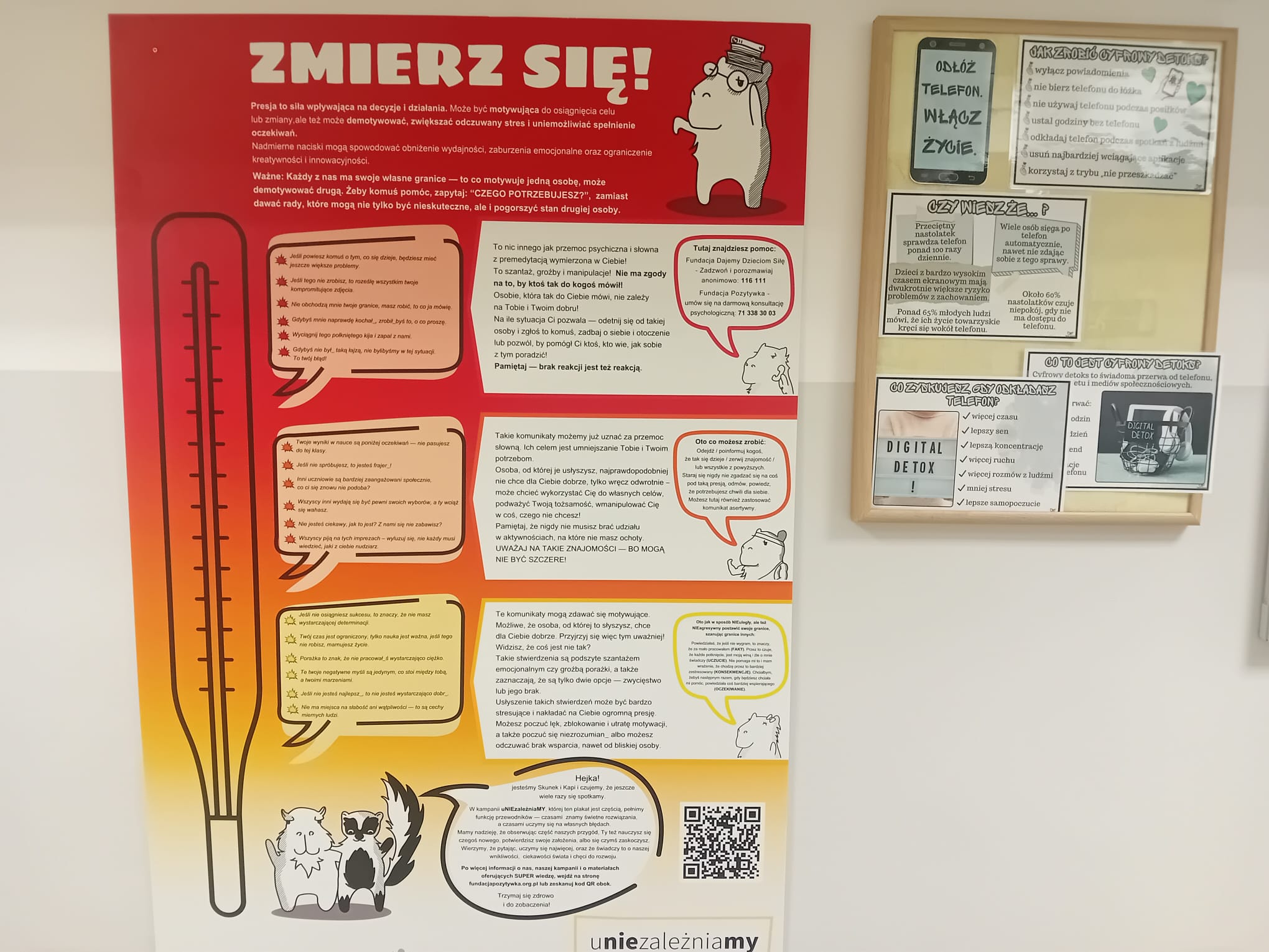 Nasza szkoła włączyła się do programu Fundacji Pozytywka „Uniezależniamy”. Projekt koncentruje się na rozwijaniu umiejętności rozpoznawania różnych form uzależnień oraz właściwego reagowania na nie. W ramach działań na I piętrze – w obu częściach korytarza w budynkach przy ul. Białowieskiej oraz przy ul. Borowskiej – umieściliśmy dwie tablice z infografikami. Znajdują się na nich materiały dotyczące rozpoznawania przemocy psychicznej, w tym przykłady zdań i zachowań, które mogą o niej świadczyć. Zachęcamy do zapoznania się z nimi, aby lepiej rozumieć tego typu sytuacje, odpowiednio reagować oraz stawiać granice w relacjach. Na tablicach zamieszczono również praktyczne wskazówki, jak radzić sobie w kryzysie psychicznym oraz gdzie szukać wsparcia. Mamy nadzieję, że przygotowane materiały będą pomocne i skłonią do refleksji nad własnym dobrostanem oraz relacjami z innymi. Serdecznie zapraszamy do uważnej lektury.